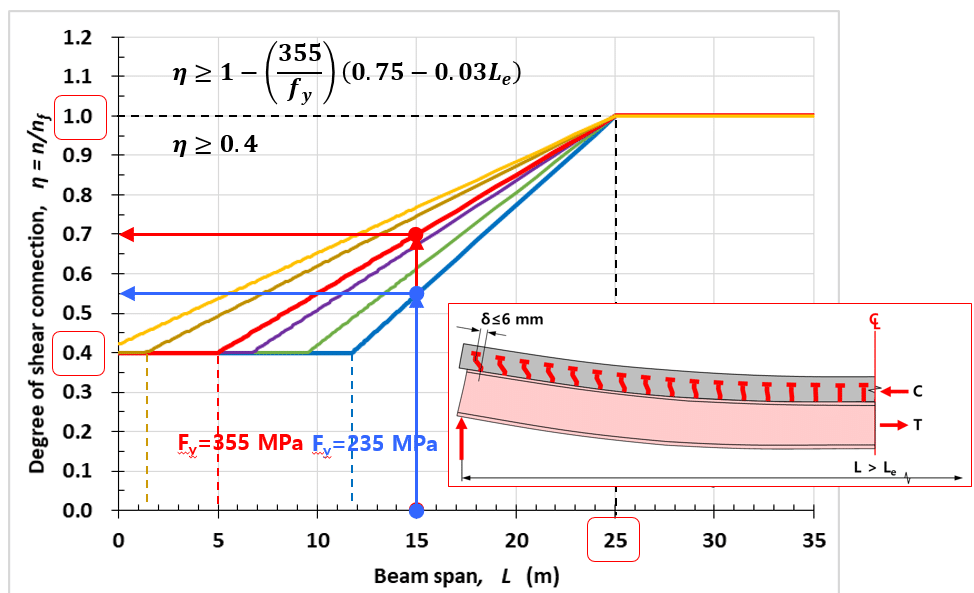 1980년대 중반까지, 합성보의 설계에서 전단연결부의 구체적인 슬립성능을 검토하지 않고 소성응력분포법에 기초한 휨강도를 결정한 것은 합리적이었다. 이는 주로 높은 합성정도를 갖도록 설계하였고, 대부분의 경우 비교적 스팬이 짧았기 때문이다. 오늘날 합성보는 (고강도강재의 사용과) 사용성에 지배되는 장스팬이 많이 사용되므로 합성정도가 낮게 설계되는 경향이 있다. 합성정도가 낮은 장스팬 합성보는 전단스터드에 추가 변형이 발생한다. Mujagic et al.(2015) 및 Selden et al.(2015)은 합성 정도가 낮게 설계된 장스팬의 합성보는 전단연결재의 변형능력이 부족하기 때문에 공칭강도에 도달하지 못할 수 있다고 지적한다.